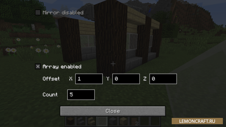 Мод на копирование построек Effortless Building является довольно простым модом, который позволяет упростить жизнь строителя. С его помощью вы сможете копировать уже построенные вами строения. Процесс копирования заключается в следующем: когда вы установили какой то блок, в тот же момент устанавливается аналогичный блок в зеркальном отражении от первого. Для того, что бы открыть меню мода используйте кнопки Num0, Num1. В итоге включится режим Quickreplace который позволит заменять блоки из одного материала на блоки из другого материала.